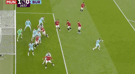 第27分钟,姆伯莫右路精准斜传,达洛特突破造成沃克犯规。随后B费定位球传中,卡塞米罗头球攻门击中横梁反弹下来,又打在库伦的背部折射入网,杜布拉夫卡将球捞出来,裁判示意皮球已经完整越过门线,曼联总算取得领先,1-0!